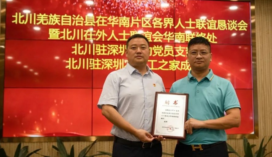 2023年5月20日上午,北川羌族自治县在华南片区各界人士联谊恳谈会暨北川在外人士联谊会华南联络处、北川驻深圳流动党员支部、北川驻深圳农民工之家成立仪式在鹏城深圳举行。县政协党组书记、主席、在外人士联谊会名誉会长王军,县人民政府副县长杨勇出席此次活动,县政协党组成员、副主席王辉主持会议。海南省绵阳商会白贵林秘书长受王平兴会长委托参加会议。